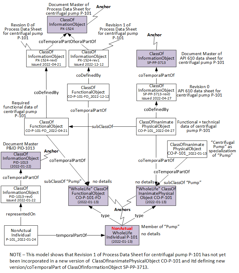The "anchors" are a fixed point of reference in an ever-changing design world, from being brought into existence (e.g. on an Equipment List or Instrument Index), via a more precisee generic classifiction, to various revisions of a defining data sheet. Apart from their declaration data there is no further information attibuted to an anchor (Think about what information applies to a human being from birth to death). All information is attributed to a temporal part (individuals) of class of temporal part (classes). So when when the pump casing is required to be made of 316SS, and later of Stainless steel minumum 13 CR, that is shown on twp different revisions of the data sheet, but is also information attributed to two diferent class of temporal parts of the applicable anchor instance of ClassOfInanimatePhysicalObject.
