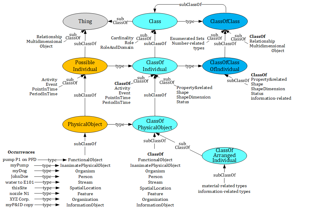 Before you dive in the details here is an overview of the conceptual model of ISO 15926-2, without the 124 Relationships and ClassOfRelationship's.