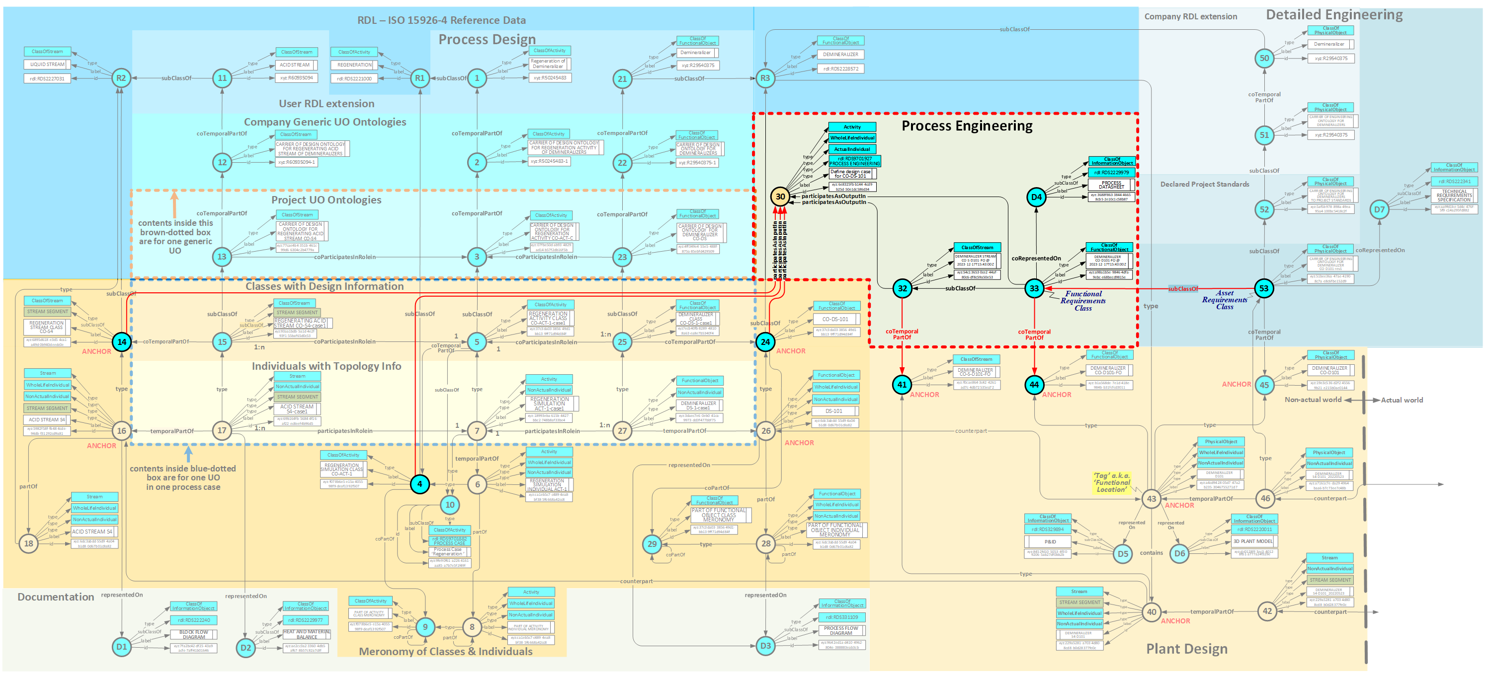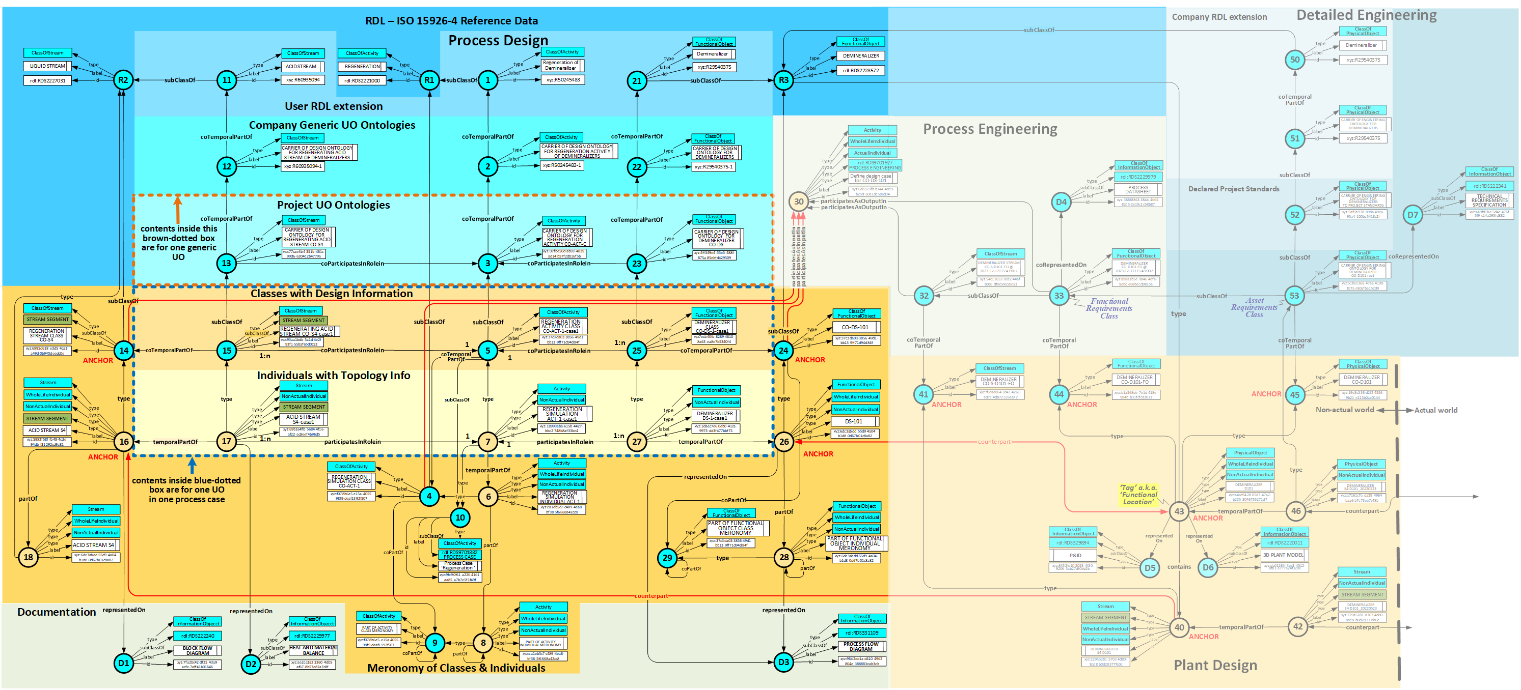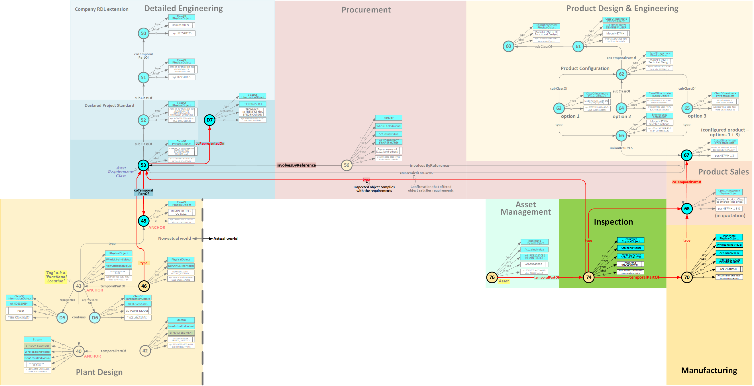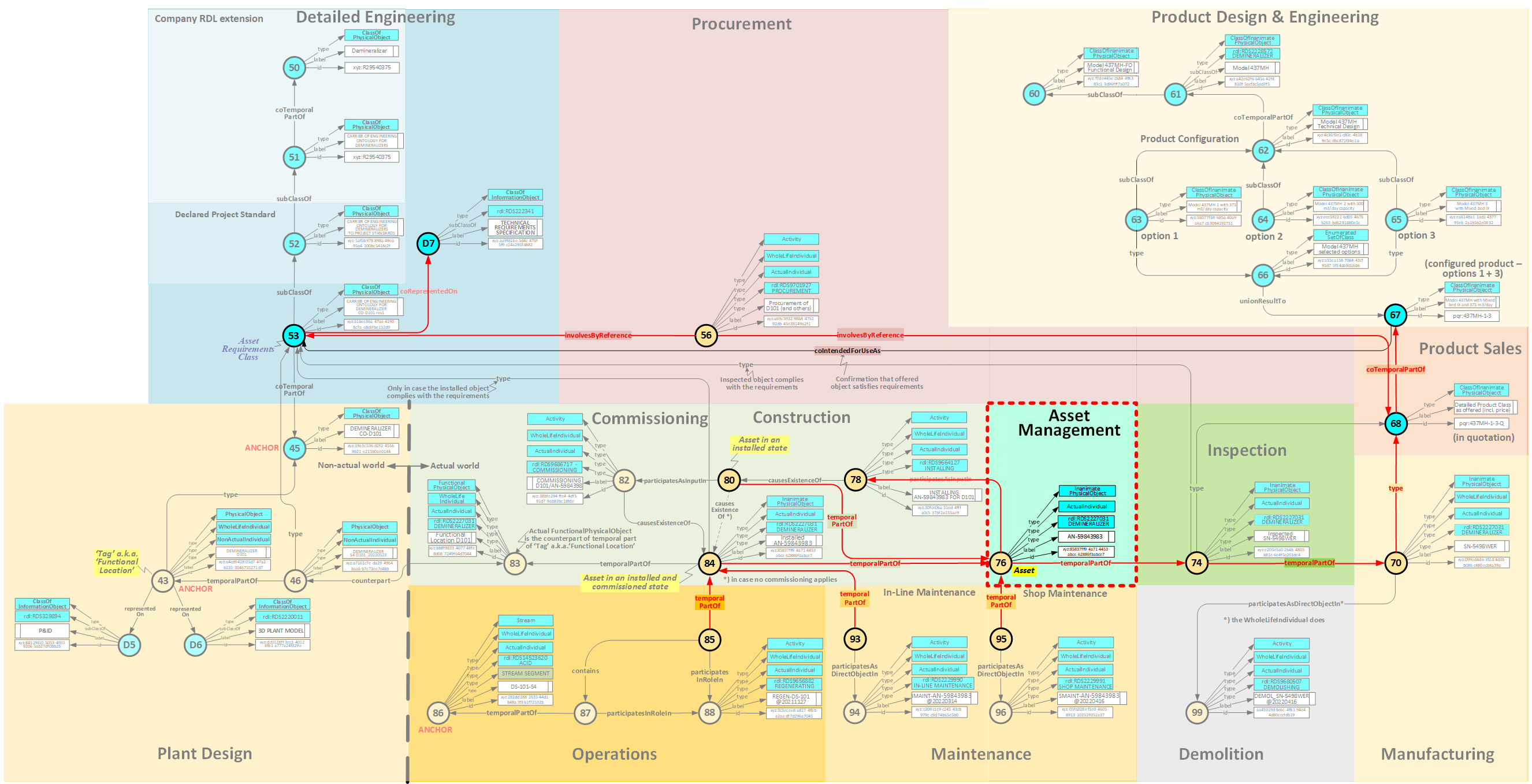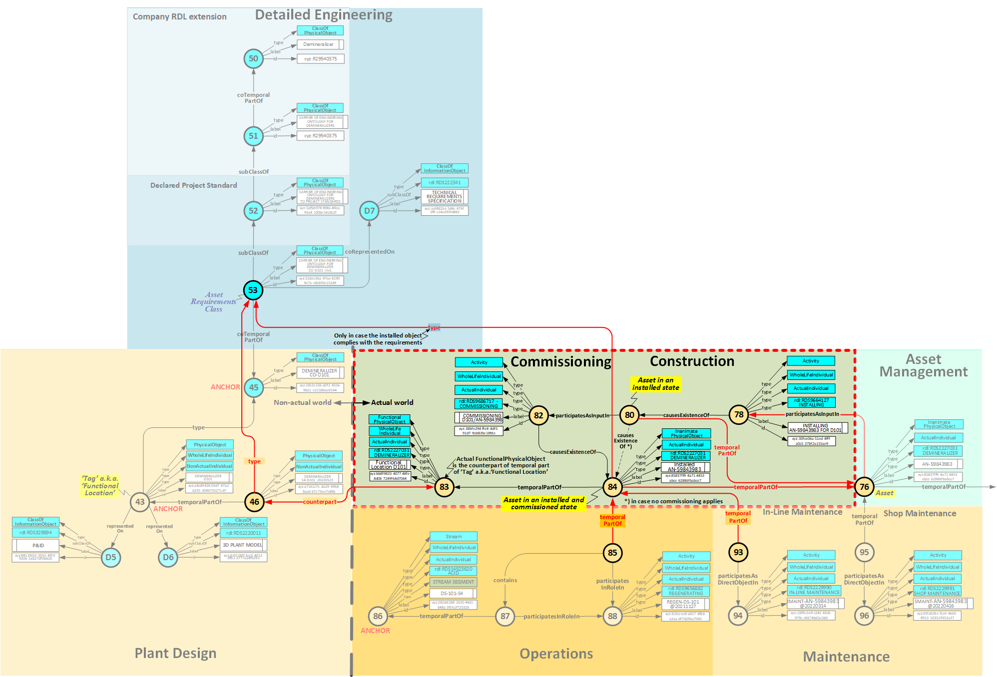 The nodes in the life of the plant item are interconnected in an ISO 15926-compliant manner. They form a "local road system" between those nodes. Note that the relations temporalPartOf and coTemporalPartOf (co = classOf) are there to allow for temporally different parts of the whole item. For example, Node 53 (Asset Requirements Class) is a coTemporalPartOf Node 45, where the latter is the "ANCHOR", i.e. the top of a temporal hierarchy that itself has no information and remains in the records as long as that is of interest for the user. Node 53 starts with, for example, the label "CO-P101-rev0", and "CO-P101-rev1" is the next instance of Node 53, so the next coTemporalPartOf Node 45. "CO-P101-rev0" remains on record forever. In this way a full audit trail is formed, but also this information remains available for analysis, for example when a revamp is required.
