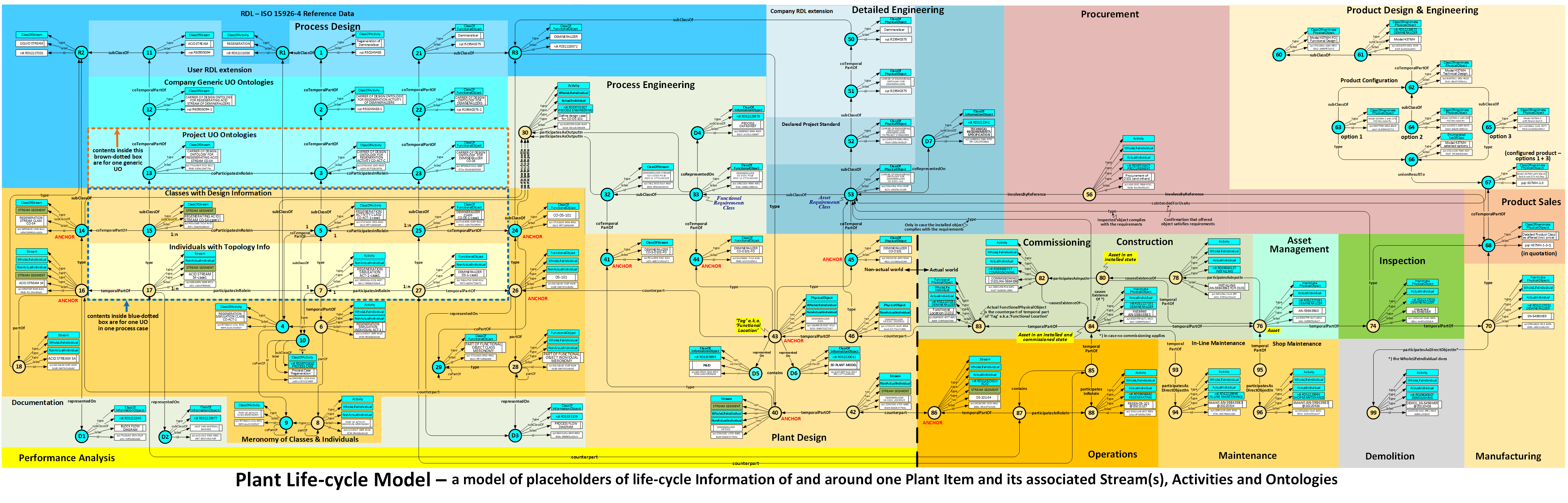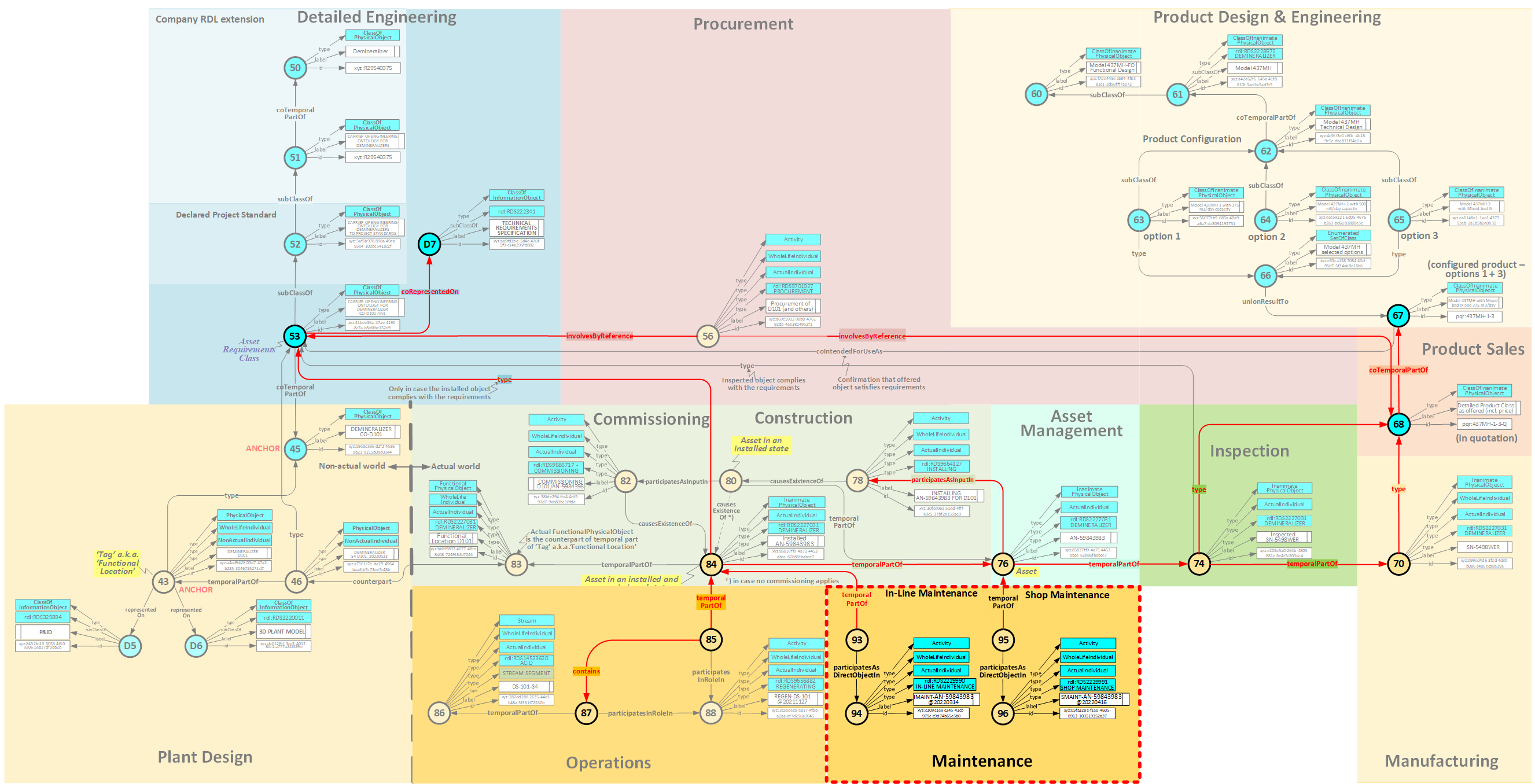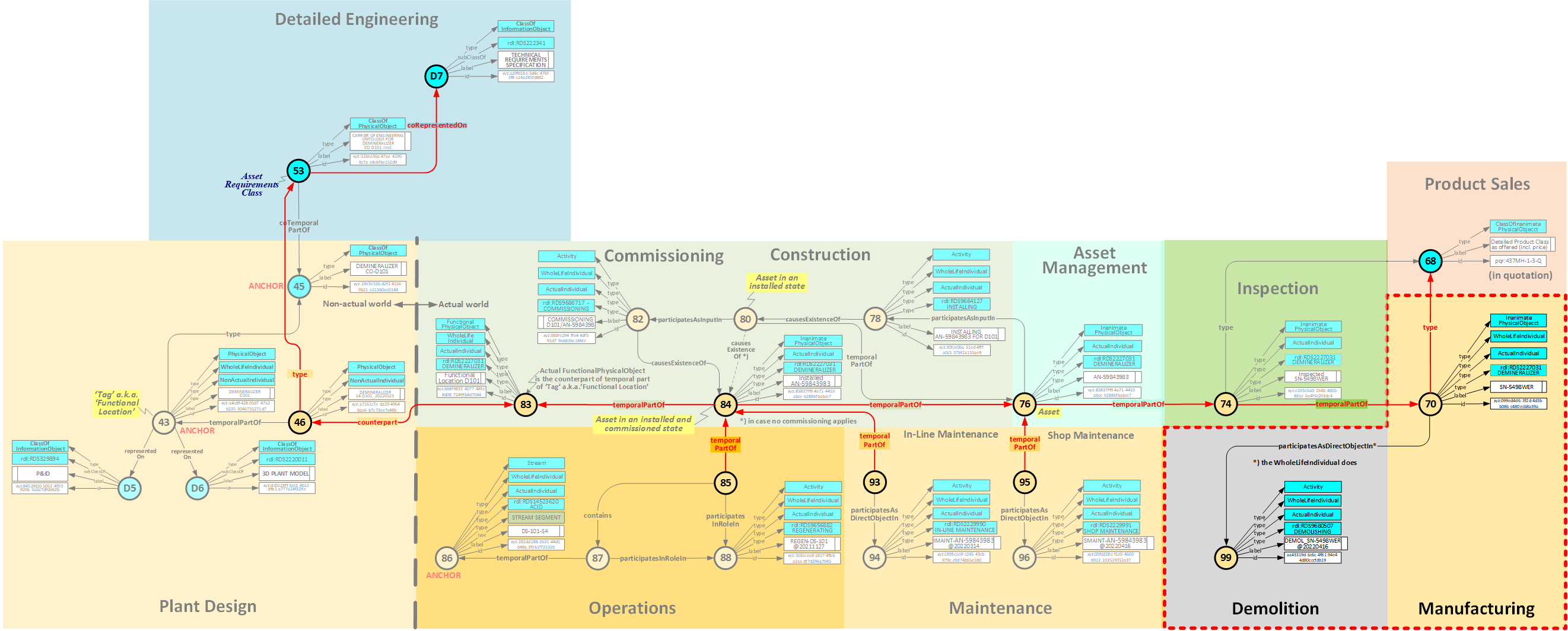 Well, it is certainly not required to instantiate the entire model anytime you want to declare a new plant item. The model tells you HOW to declare it by relating it to other nodes that have already been declared. So, in case you declare "CO-P101-rev1" you add the template IndividualHasTemporalPart, thereby linking it to Node 45. In the excerpt models for the various lifecycle activities (below) relations to other lifecycle stages are shown in red, and can be used for that purpose (iff the other side is already known, of course). In case more relations are known, use them all.