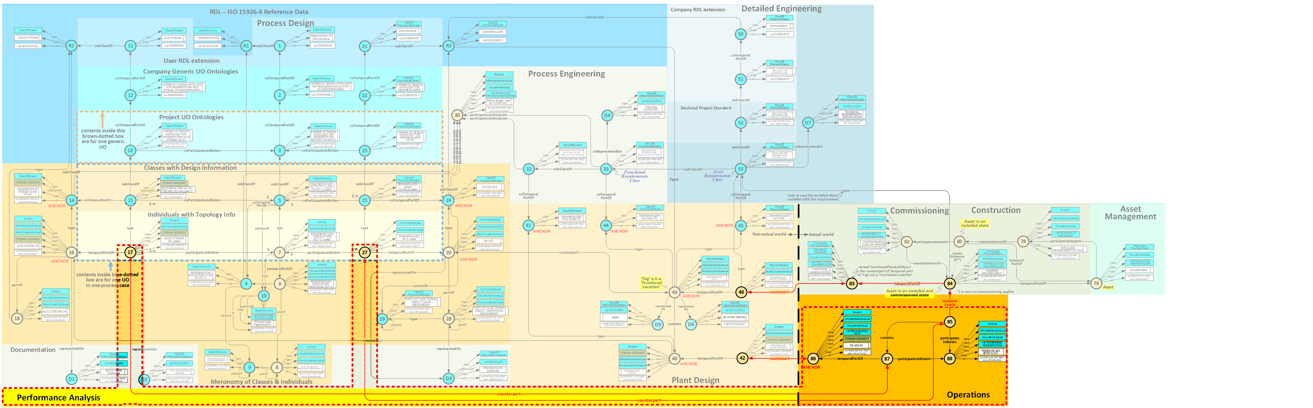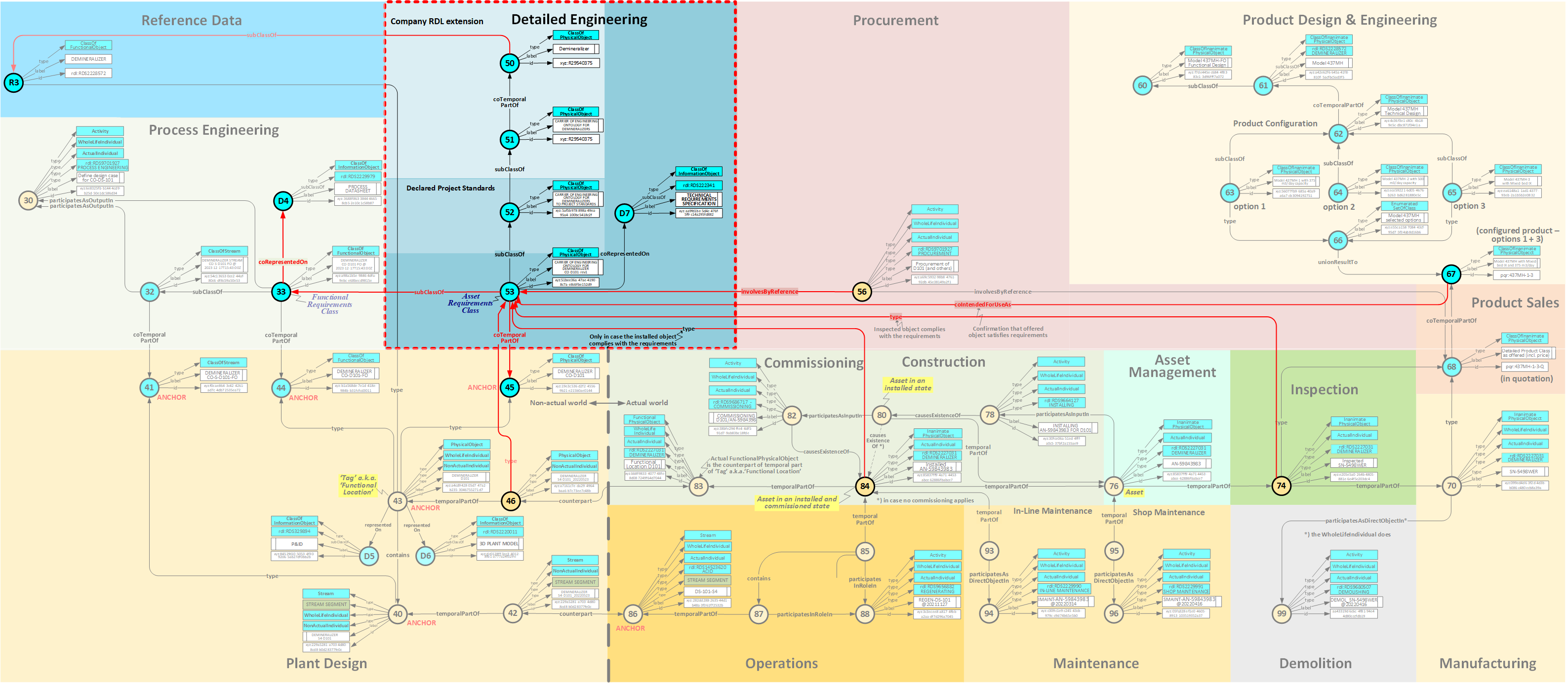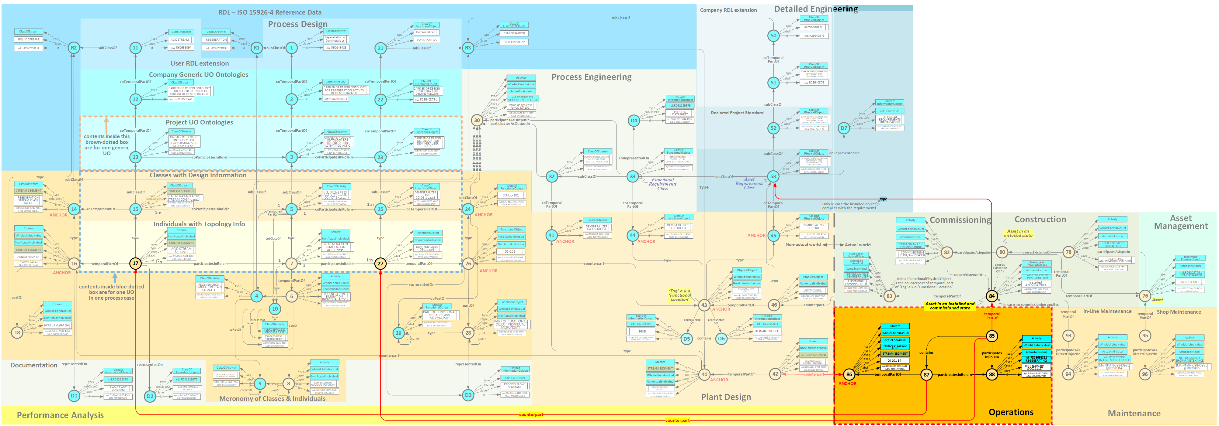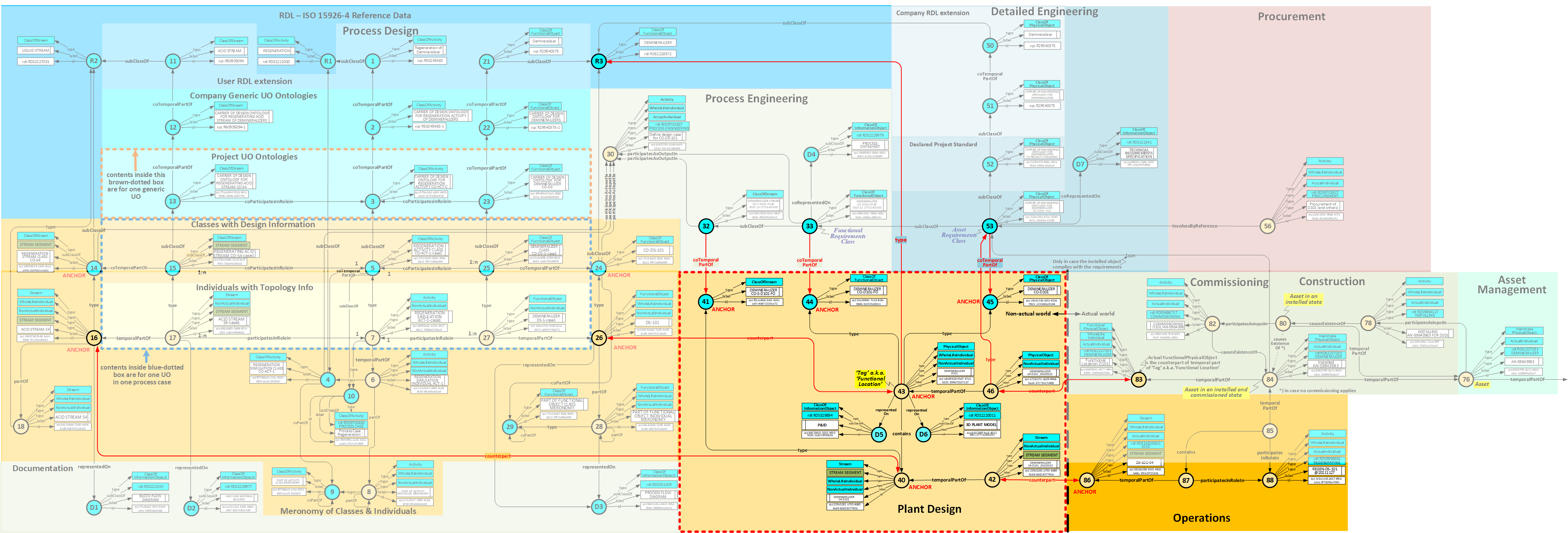 Well, it is certainly not required to instantiate the entire model anytime you want to declare a new plant item. The model tells you HOW to declare it by relating it to other nodes that have already been declared. So, in case you declare "CO-P101-rev1" you add the template IndividualHasTemporalPart, thereby linking it to Node 45. In the excerpt models for the various lifecycle activities (below) relations to other lifecycle stages are shown in red, and can be used for that purpose (iff the other side is already known, of course). In case more relations are known, use them all.