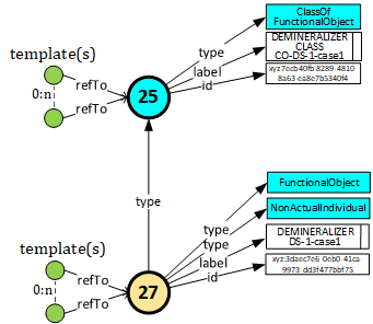 The Individuals [17], [7] and [27] are, predominantly, the placeholder for topological information (source, destination, location), and the Classes [15], [5] and [25] are the (functional) Requirements Classes, holding the design information for a process case.