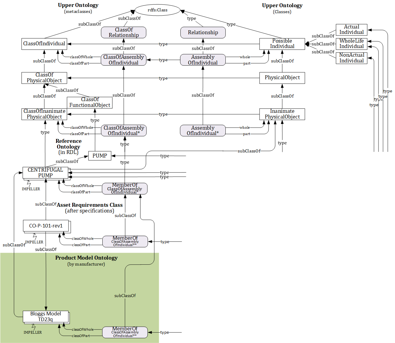 A difference with the Engineering Ontology is that the Product Model has to accomodate various types, options, extras, sizes, materials, etc of the products. That is a bit more complex from a modeling point of view. I'll take a part of the Plant Life-cycle Model to illustrate that: