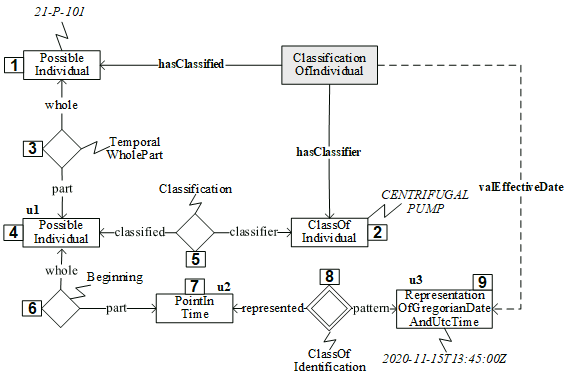 In above graph the semantics are: a temporal part of 21-P-101 is classified as CENTRIFUGAL PUMP as of 2020-11-15T13:45:00Z. The reason why [4] is not in the signature simply is that there is hardly, if at all, commercial software that works with temporal parts, so we keep referring to the temporal whole, in most cases the declared thing, serving as an anchor, but the semantics are about a temporal part of that anchor.