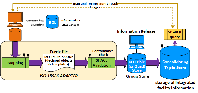 The results are presented in a Turtle file. This file is validated with SHACL and temporarily stored as N-triples in a Triple Store, with Part 9 API, of the group/discipline that generated these data. Employees of that group check the correctness and completeness of the mapped data and release those for which they can take responsibility. The triples end up in the Project Triple Store. At some point in time at or before project close-out these consolidated triples are handed over to the project principal, who can have the same set-up for his integrated life-cycle information.