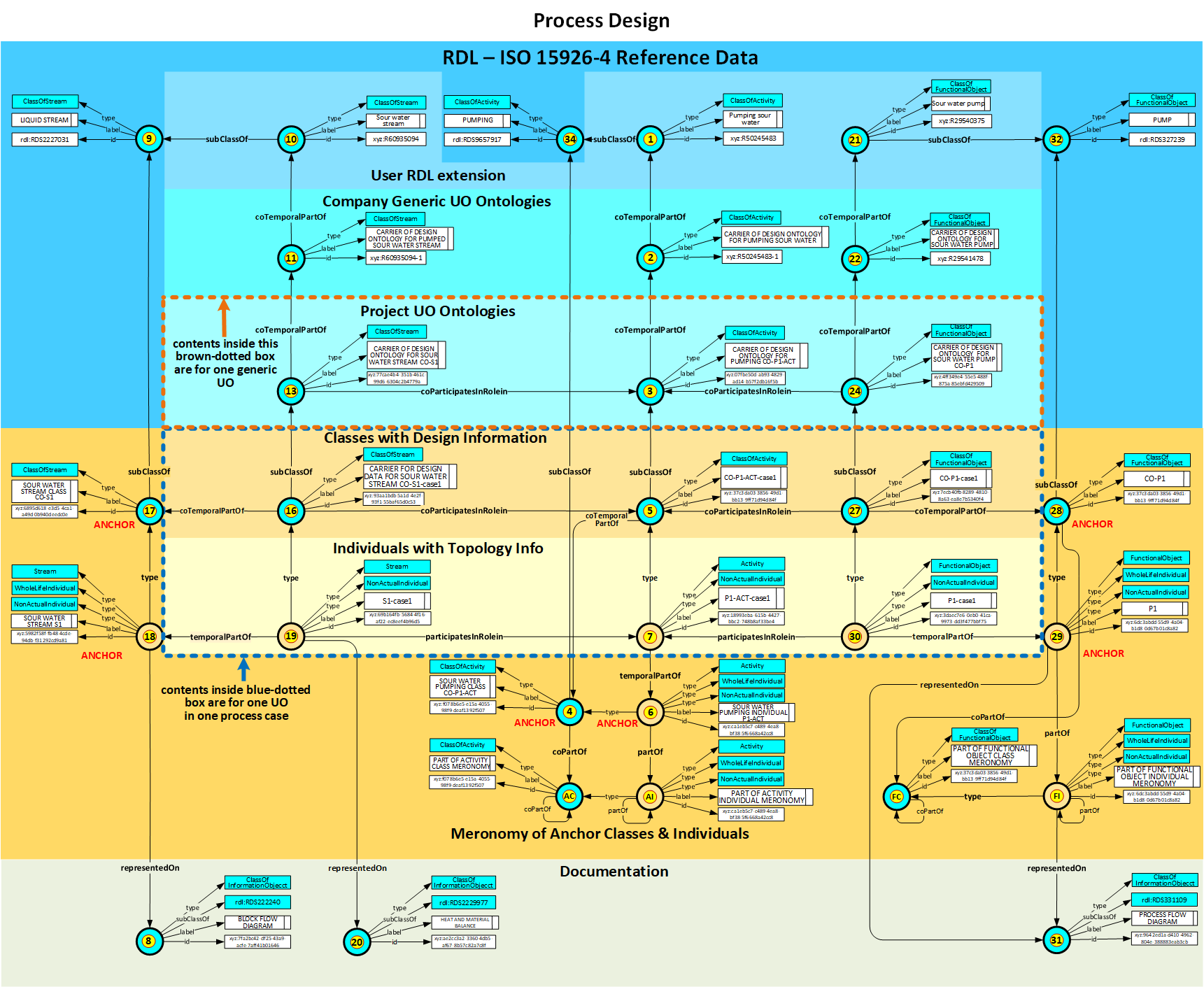 - [16] Now we enter the 'red-dotted box' for the recording of actual Process Design data sets, that are, because of it being a subClassOf [13], in accordance with the requirements of [13]; Since this is also a coTemporalPartOf the 'anchor' stream class [17], more than one such data sets can be recorded for different process cases (e.g. summer vs winter operations); Note that the design information is attributed to the Class, where only topological information is attributed to the Individual [19} below;