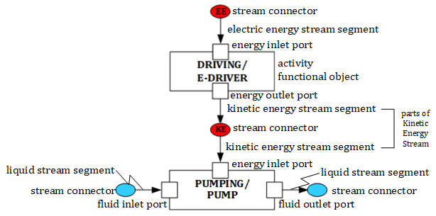 On most BFD's (Block Flow Diagrams) it can be noted that some blocks show a verb (for Activity) and some a noun (for the object performing or enabling that Activity). In the code both the Activity and the related FunctionalObject are covered, but on a BFD the combination is shown, like this representation of a combination of the UO Pumping and a UO Driving. NOTE - This representation is meant to be informative-only. The terms shown are used in the Turtle code below.