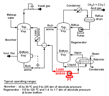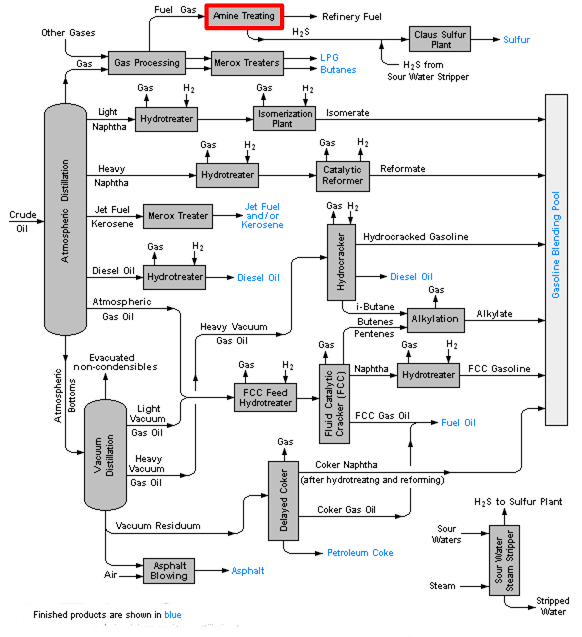 If we detail the uppermost, redlined,block in the above BFD for an oil refinery ("Amine Treating") we can draw a PFD like this: