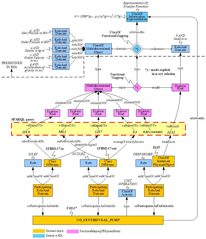 The graph below shows, as an overview, how an equation for a Unit Operation can be modeled and how data can be linked to variables in that equation. The colours indicate declarations or templates, see legend at the bottom of the diagram.